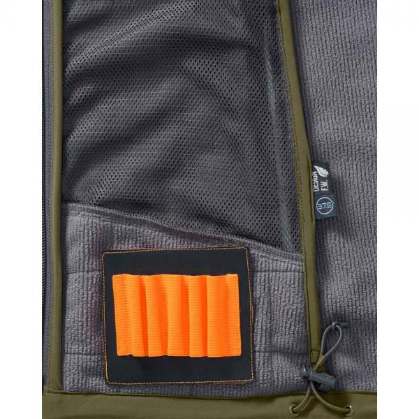 Das neu für Merkel GEAR konzipierte, abriebfeste 4-Wege-Stretch Soft-Shell besteht aus einem technischen, hochaktiven 37.5™-Polyester-Gewebe und macht jede Bewegung mit. Ein enganliegender Stehkragen wärmt die Halsregion. Auf alle unnötigen Nähte wurde verzichtet, um Druckstellen zu vermeiden. Dank einer verbesserten (PFOA & PFC freien) DWR-Beschichtung, perlen Regentropfen einfach ab. Die Weste verfügt über eine dezente aber großvolumige Brusttasche, die mittels lautlosem Reißverschluss verschlossen werden kann. Zwei große untere Handwärmetaschen fungieren mit ihrem teilweisen Netzfutter als zusätzliche Belüftungsmöglichkeit. Der untere Teil der Taschensäcke ist mit weichem Loop-Fabric ausgeschlagen, das ein Anheften des mitgelieferten Patronen-Patches gestattet und gleichzeitig die Hände wärmt.
