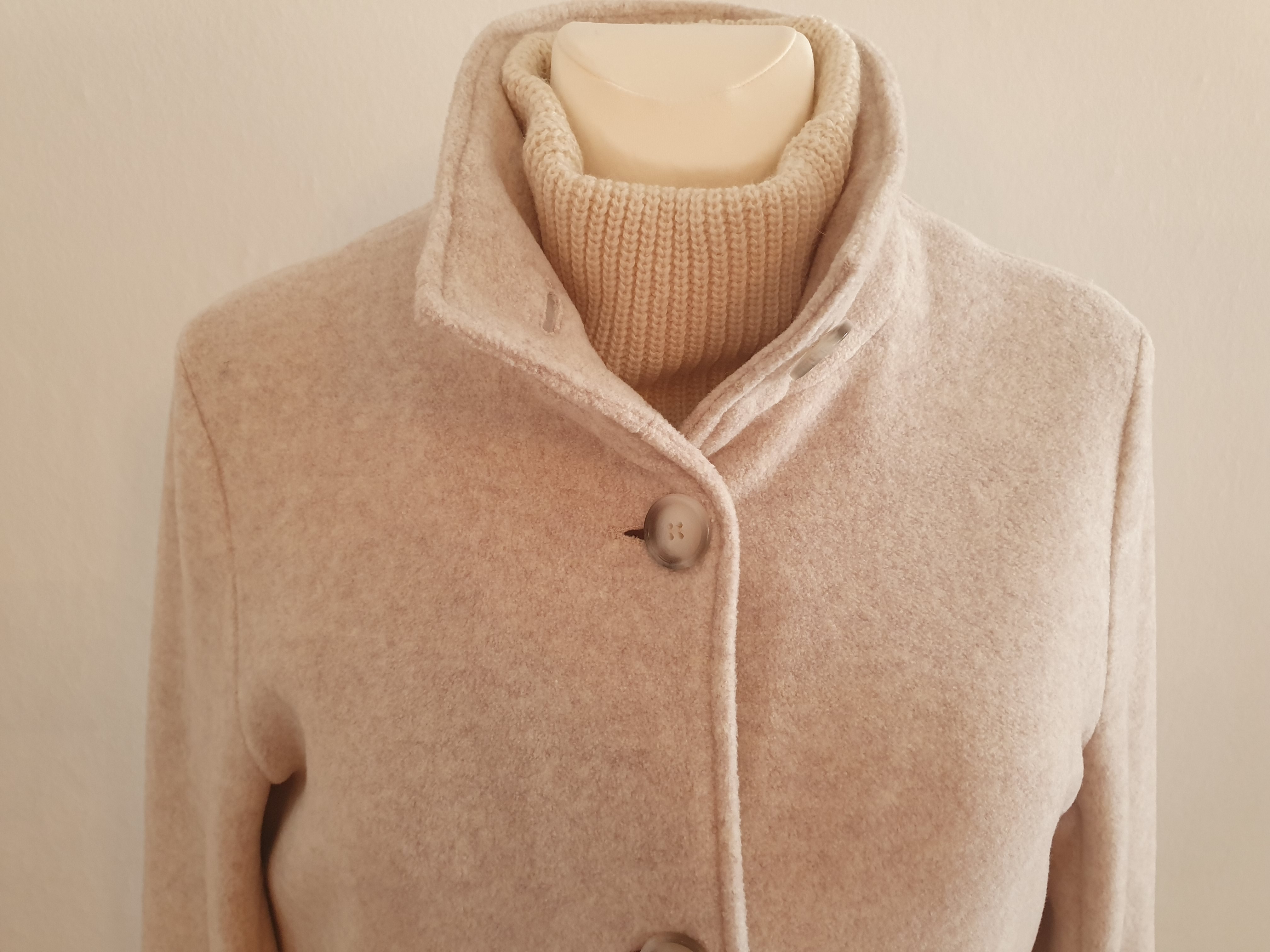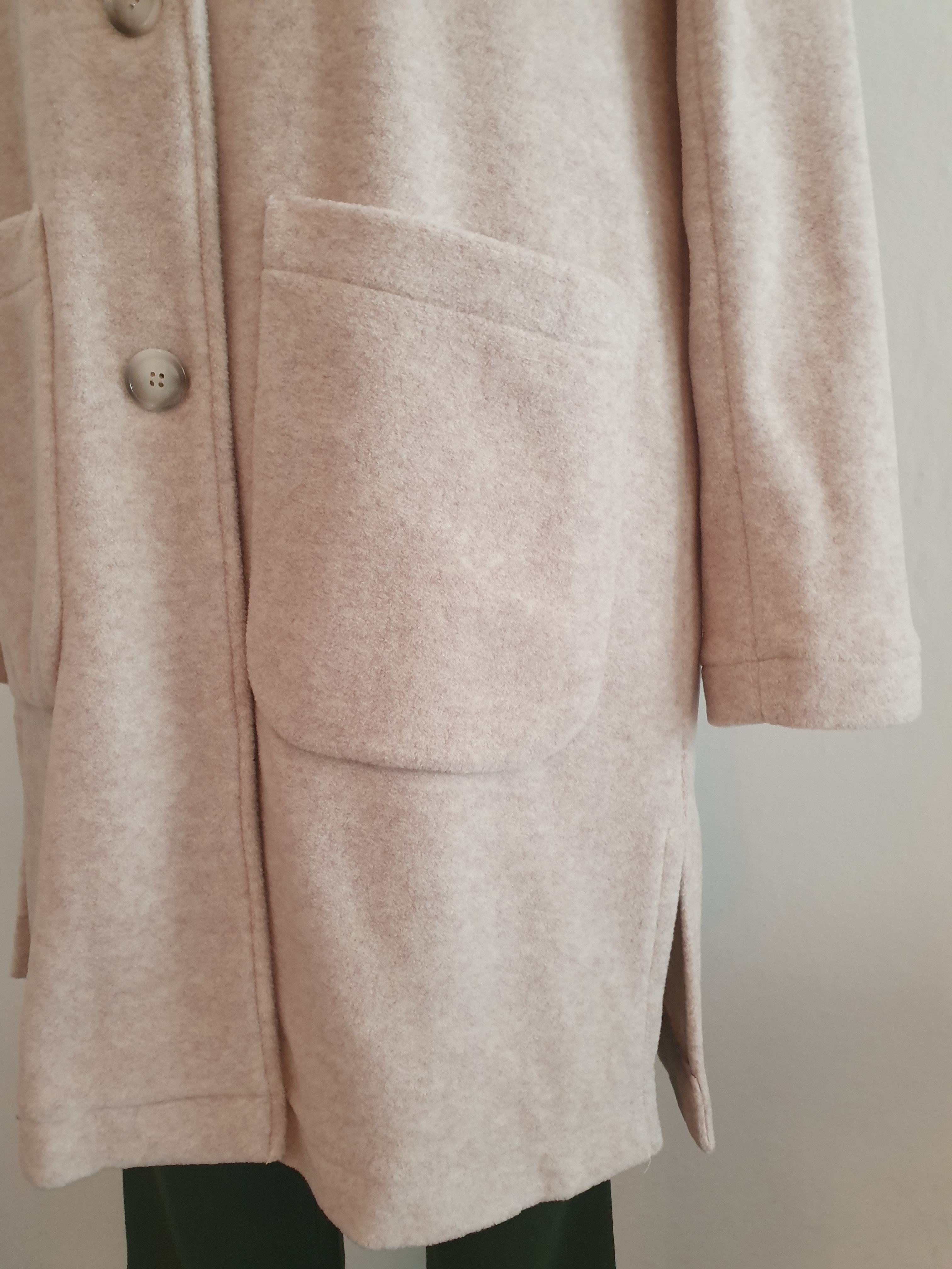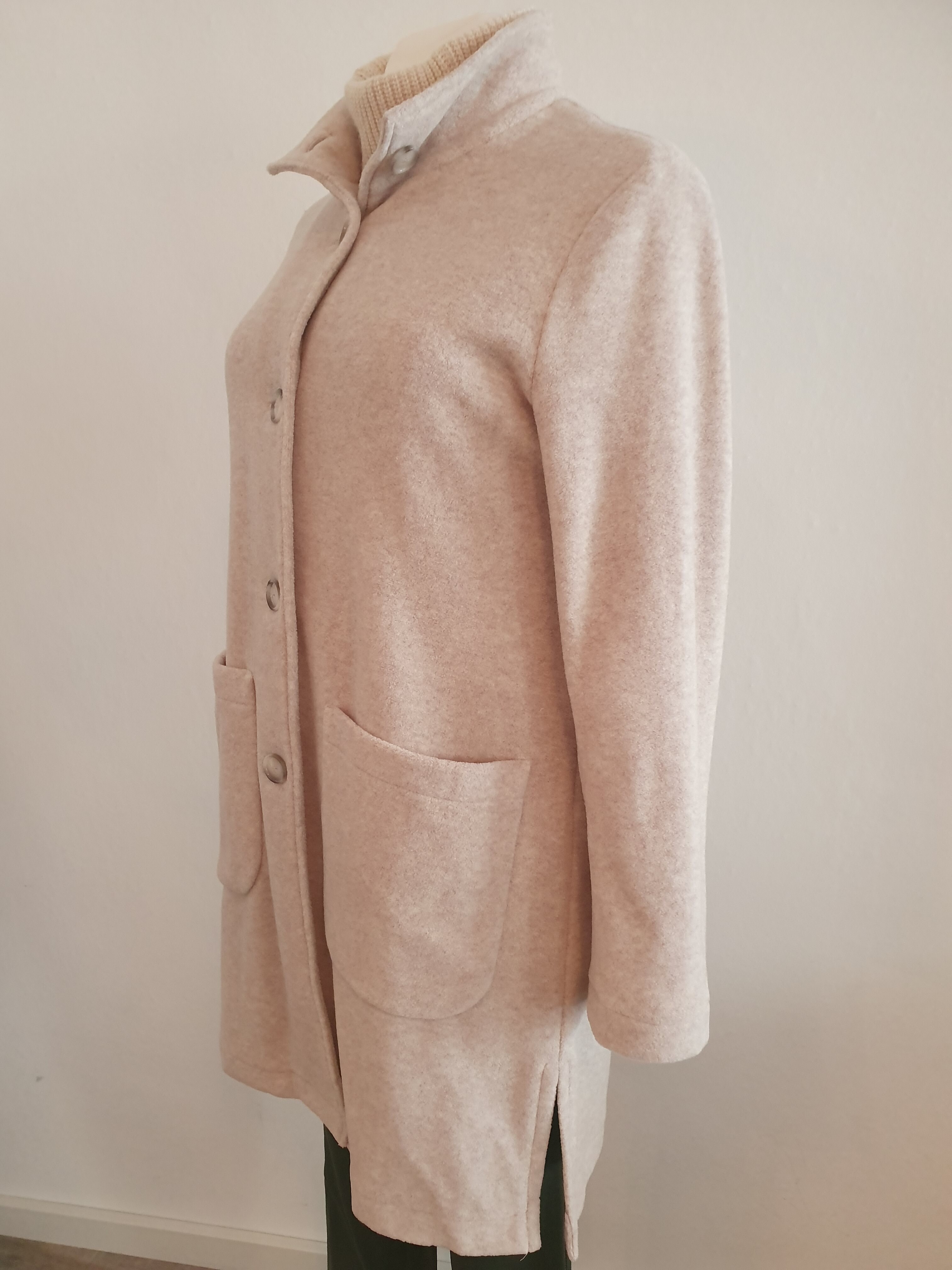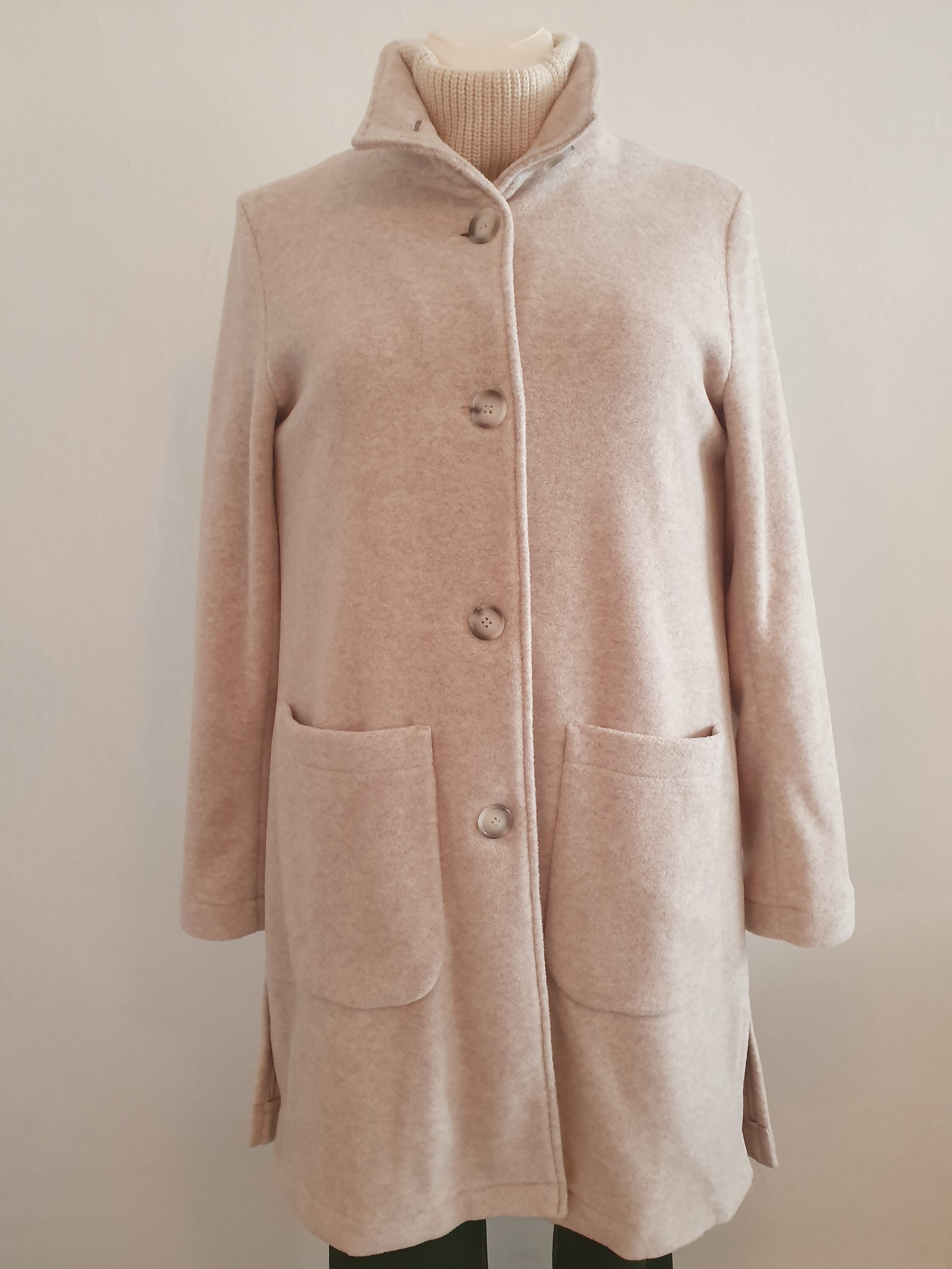 Ein schöner und bequemer Partner für die kühleren Tage. Der leichte Fleecemantel ist weich an der Haut und soft im Griff. Mit dem Stehkragen und den großen aufgesetzten Taschen kann Frau sich vor dem Herbstwind schützen. Die kontastierenden Hornknöpfe geben dem Mantel einen schönen Akzent.