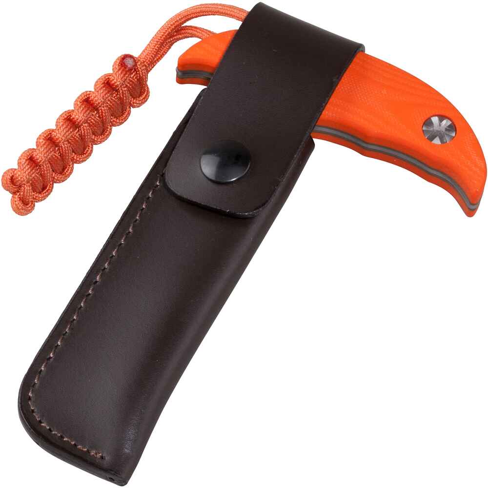 Eine Besonderheit ist, dass der Griff aufgeschraubt werden kann (z. B. mit einem Münzstück) und im Inneren ein kleines Fach für Utensilien wie Nadeln, Streichhölzer etc. eingebaut ist. Der ausgeprägte Fingerschutz und die Fingerrillen sorgen für Sicherheit beim Arbeiten. Die Lieferung erfolgt inklusive Lederscheide.