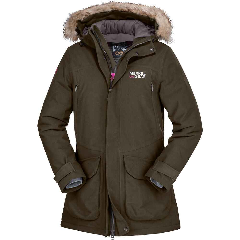 Im Inneren der Jacke finden sich zwei sehr große Seitentaschen, die mittels lautlosen Zippern zu schließen sind. Zwei Mesh-Einschubtaschen für optionale Wärmepads sitzen auf Höhe der Nieren. Den mit 37.5®-Partikeln ausgerüstete Oberstoff des Parkas bildet geräuscharmes, aufgerautes Mikro-Trikot. Im Inneren der Jacke sowie im Inneren der Kapuze sorgt eben dieses Material für ein angenehmes Gefühl auf der Haut. Das restliche Innenleben ist aus gutgleitendem Taffetta gearbeitet und mit einer dezenten MerkelGEAR-Ornamentik verziert.