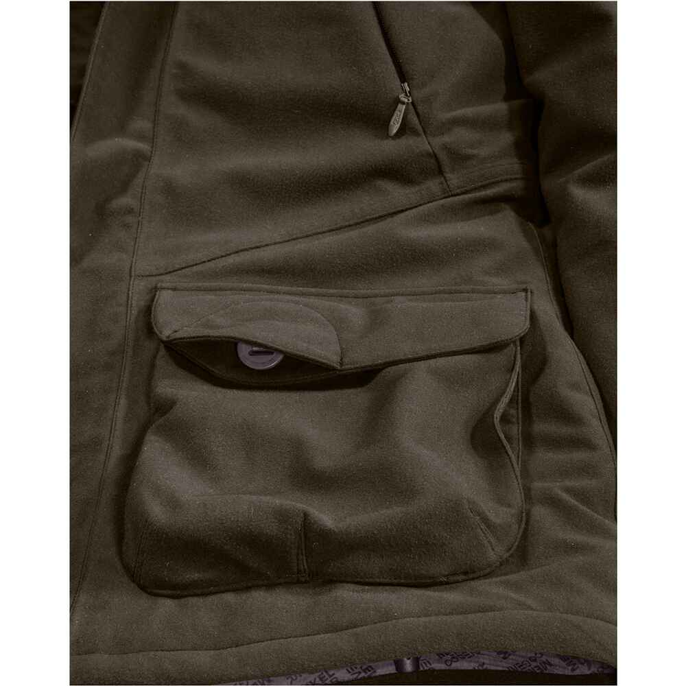 2 extragroße, weich gefütterte Napoleontaschen können mittels so genannter unsichtbarerer Reißverschlüsse der stabilen Größe #5 verschlossen werden. Im geschlossenen Zustand fügen sich die Reißverschlüsse unauffällig ins Design des Parkas. 2 Große Pattentaschen, die mittels großdimensionierten Schlaufenknöpfen verschlossen werden können, sind für die Nutzung des MerkelGEAR-Patronensystems vorgesehen. Dank des großen Knopfes lassen sich die Taschen auch mit kalten Fingern noch gut öffnen.