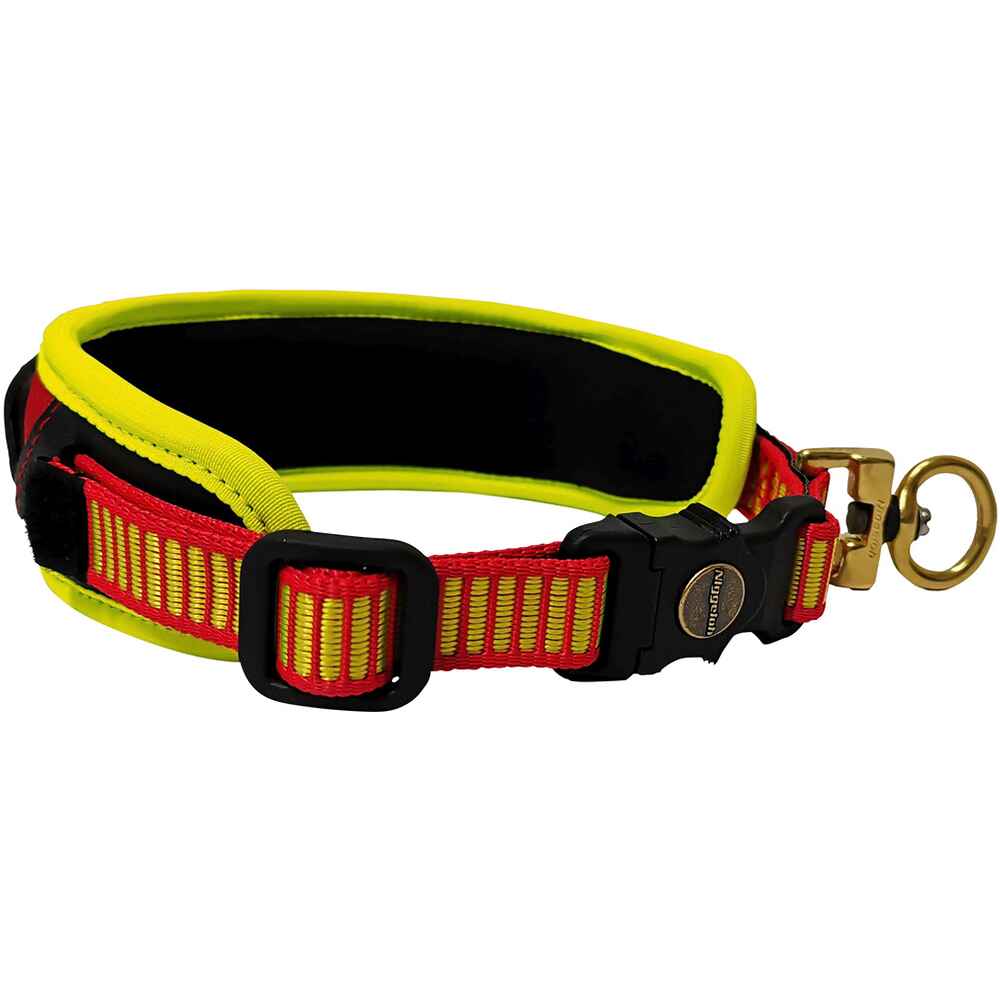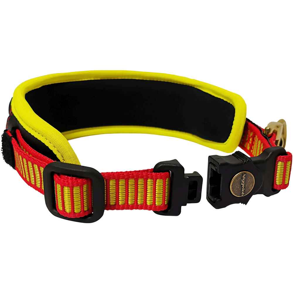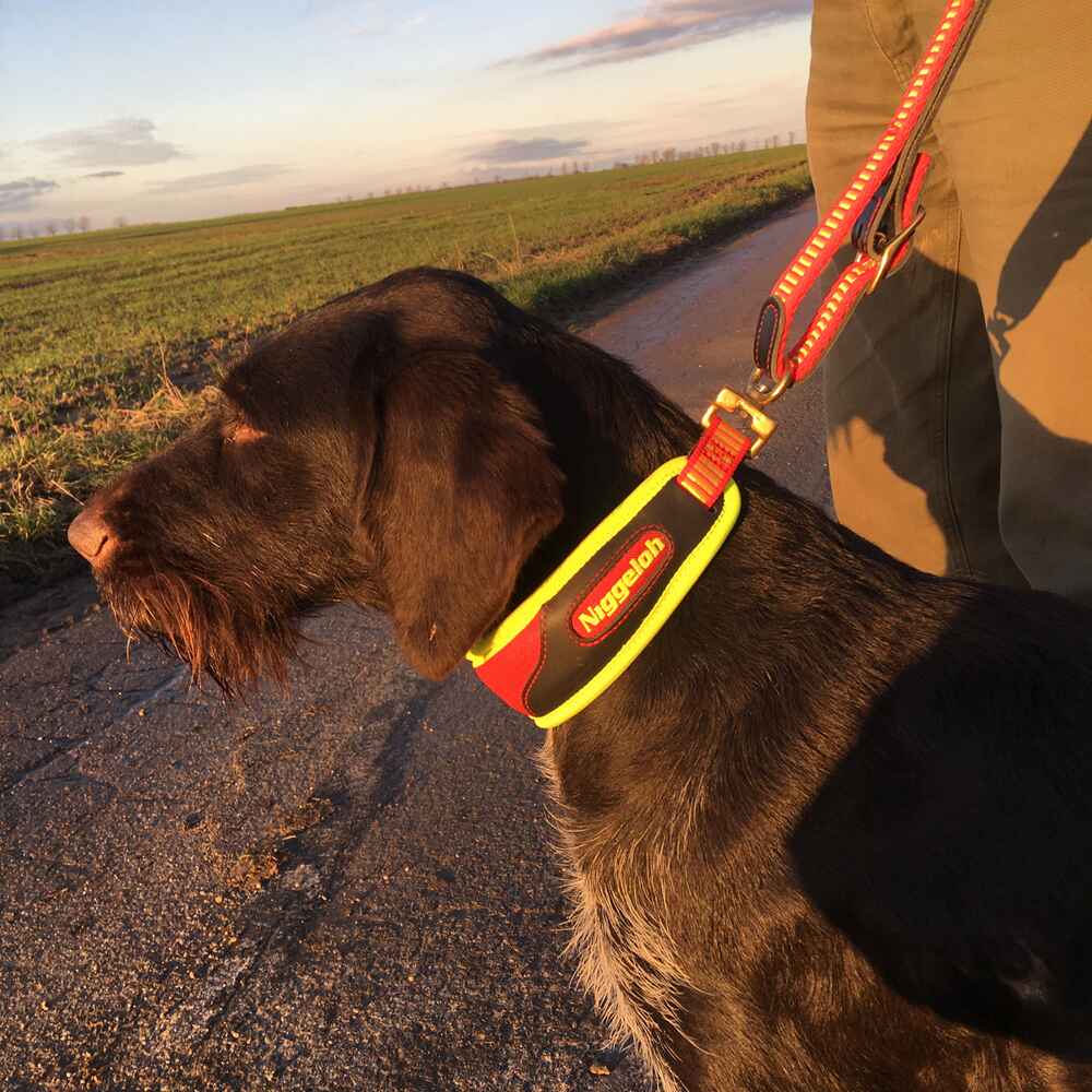 Niggeloh hat die über Jahre bewährte und beliebte Schweißhalsung um einen hochstabilen Schnellverschluss ergänzt. Ein Zug am Schnellverschluss öffnet die Halsung und gibt den Hund frei – ohne ihn zu stören!