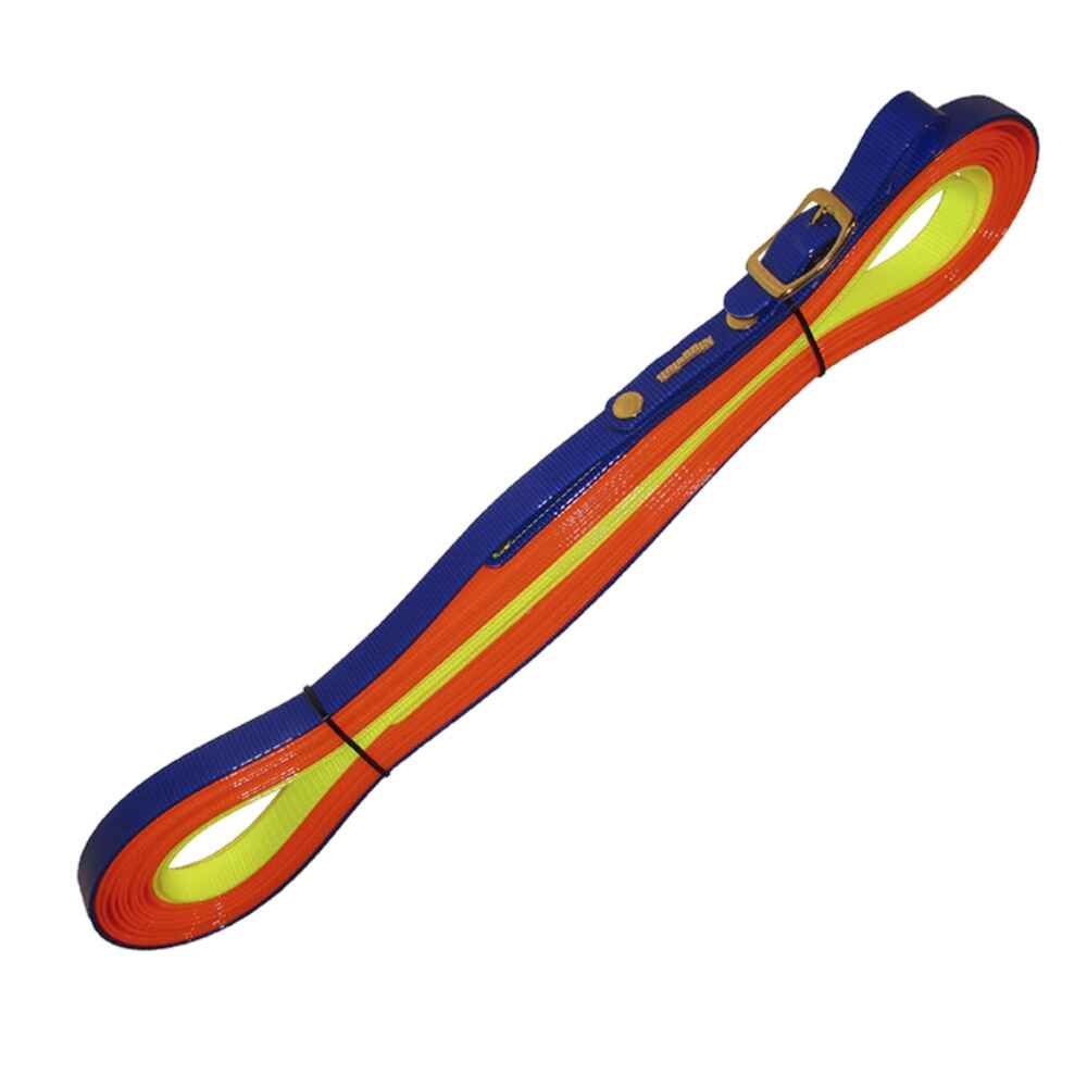 Befestigung an Halsung/Geschirr mittels flacher Dornschnalle. Die ersten 1,5 Meter des Riemens bestehen aus einem etwas dickeren, blauen Biothane Gold Opaque. Dadurch werden Verwicklungen der Leine um die Läufe des Hundes weitestgehend vermieden. Das Mittelstück der Leine ist aus Biothane Gold Opaque in leuchtorange gefertigt. Die letzten 2 Meter des Riemens sind aus leuchtgelbem Biothane Gold Opaque gefertigt, um das Leinenende auch optisch früh wahrzunehmen. Eine Verdickung an dieser Stelle lässt das nahende Riemenende auch erfühlen. Resistent gegen Verschmutzung und Geruchaufnahme. Hohe Verschleißfestigkeit und somit lange Lebensdauer. Entwickelt in Zusammenarbeit mit der Schweißhundestation Südschwarzwald.