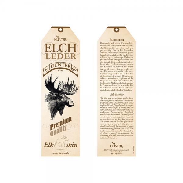 Zur Pflege des Leders ist immer sehr empfehlenswert: »Weniger ist mehr!« Elchleder ist bereits gefettet und bedarf nur minimaler Nachfettung, hierfür ist am besten ein Lederpflegeöl geeignet. Wenn das Elchleder-Produkt nass bzw. feucht geworden ist, ist eine schnelle Trocknung des Leders z.B. auf der Heizung nicht ratsam, ein Abtupfen und eine langsame Trocknung sind empfehlenswert. Zudem ist es ratsam darauf zu achten, dass keine Feuchtigkeit an den Metallbeschlägen verbleibt. Nur bei entsprechender Handhabung und Pflege kann die gewohnte HUNTER–Qualität dieser außergewöhnlichen Lederprodukte erhalten bleiben.